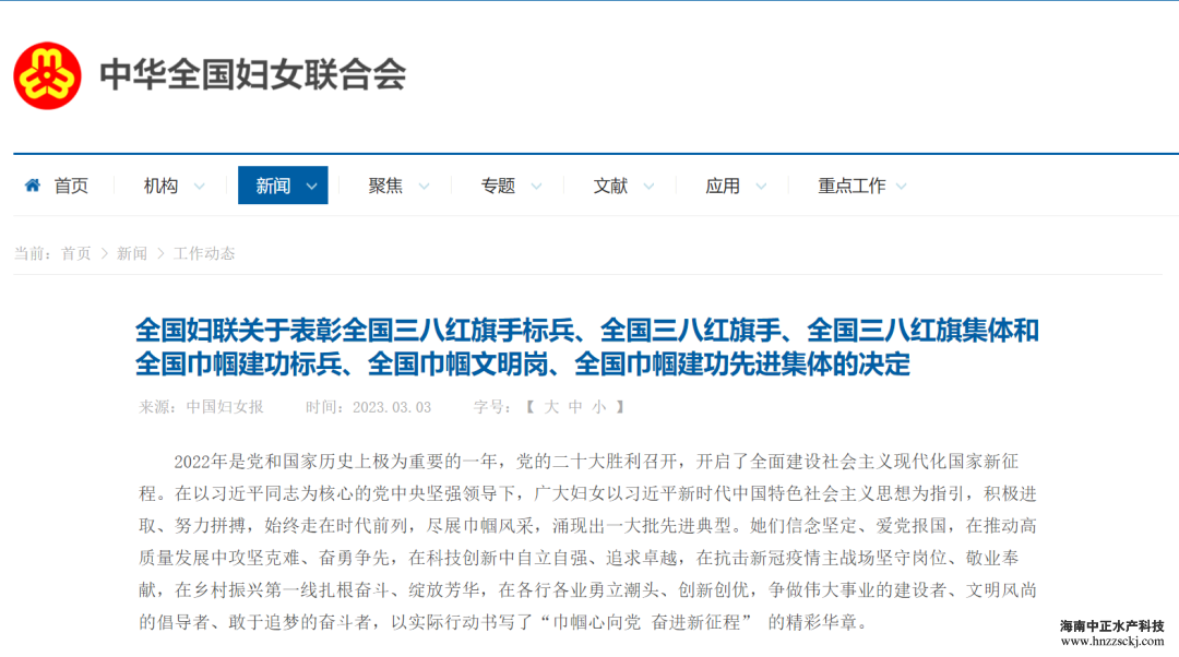 為表彰先進(jìn)、樹(shù)立榜樣,3月3日,全國(guó)婦聯(lián)表彰了10名全國(guó)三八紅旗手標(biāo)兵、298名全國(guó)三八紅旗手、199個(gè)全國(guó)三八紅旗集體、1992個(gè)全國(guó)巾幗文明崗、996名全國(guó)巾幗建功標(biāo)兵、500個(gè)全國(guó)巾幗建功先進(jìn)集體。其中,海南中正水產(chǎn)科技有限公司研發(fā)中心被授予全國(guó)巾幗建功先進(jìn)集體。